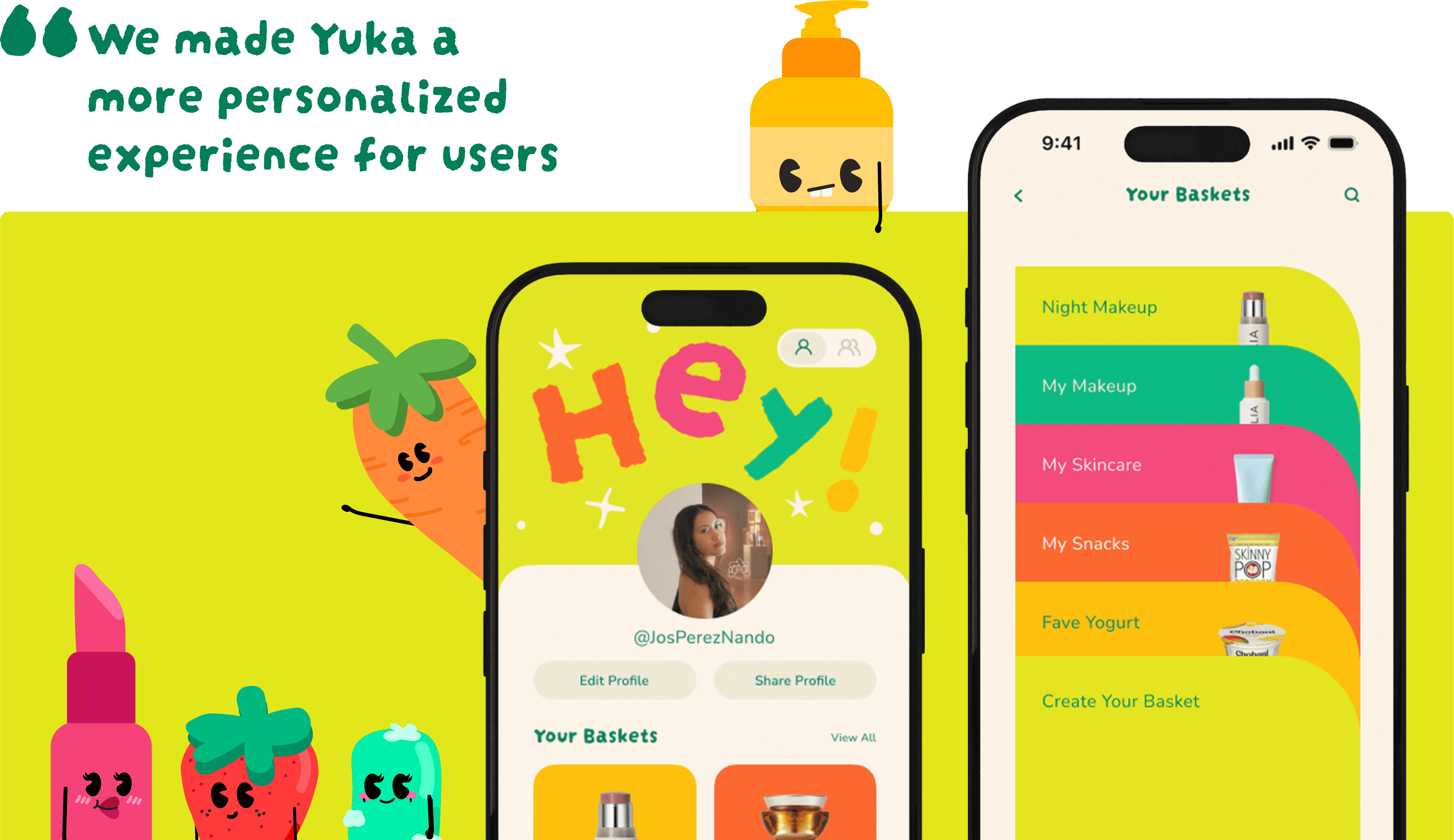 We added beauty and food characters to the Yuka branding to make the app's wellness messaging playful and engaging.